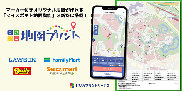 『コンビニ地図プリント』はスマホ操作で目的に応じて、印刷したい地図を生成し、著作権者(*2)の"印刷許諾付き"のプリントが可能なサービスです。今回アプリケーションのバージョンアップにより地図上に"マイスポット"マーカーを立て、任意の名前を付けることでオリジナルな地図を作成する「マイスポット地図」機能を搭載いたしました。マーカーは最大30か所までつけることができ凡例解説とともにA3サイズのオリジナル地図になります。作成された地図はコンビニでのプリント番号(*1)とともにキャビネットに保管されます。