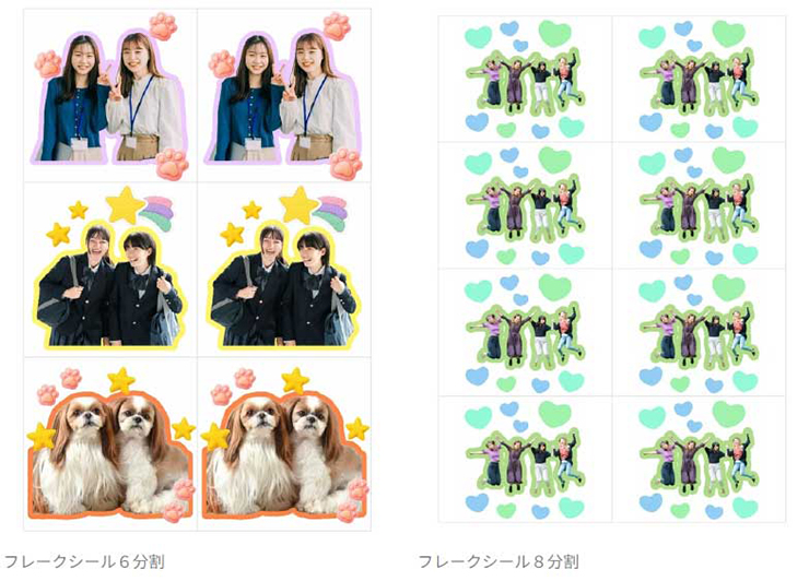 「4カットフォトシール」「インスタントフォトシール」「千社札シール」「分割割付シール」など遊び心たっぷりのシールがつくれる『コンビニシール倶楽部』の「バラエティ」に、この度「フレークシール」機能を追加しました。