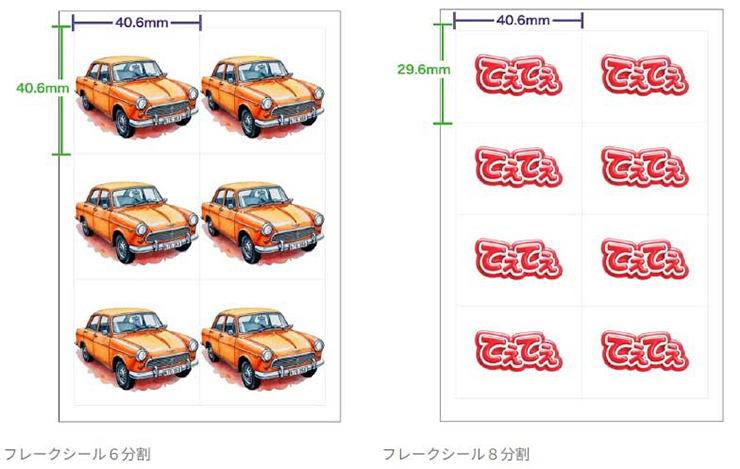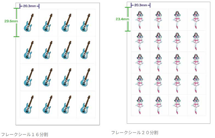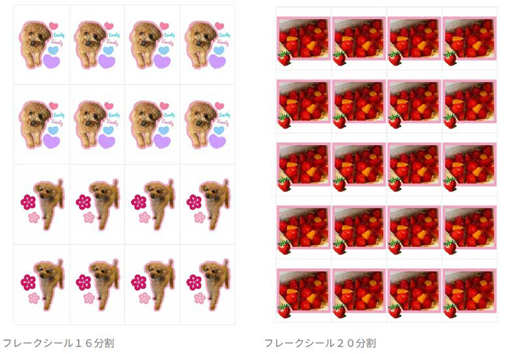 既存の「分割割付シール」の「枚数指定割付」機能よりも、さらに小さいサイズのシールを作成できるのが「フレークシール」機能です。手帳やアルバム、カレンダーなどに貼ったり、お手紙やプチギフトの封緘として使えるようなサイズのシールがつくれます。