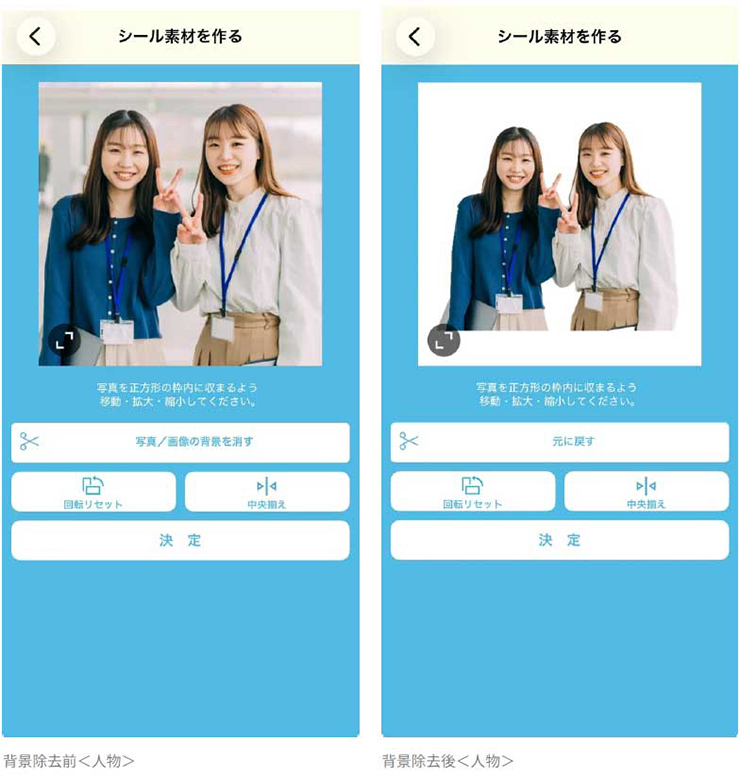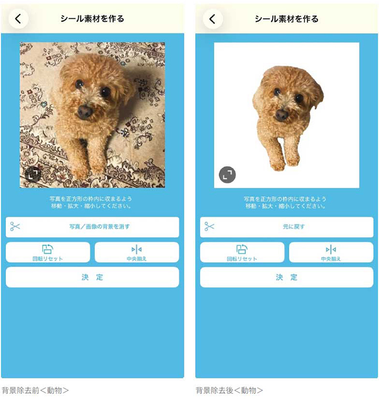 またiPhone(iOS)限定で、「背景除去」機能を搭載。写真から人物や動物などの被写体を残して背景を消すことができるようになりました。背景除去した対象物の輪郭に好みの色や太さの枠線をつける縁どりも可能です。